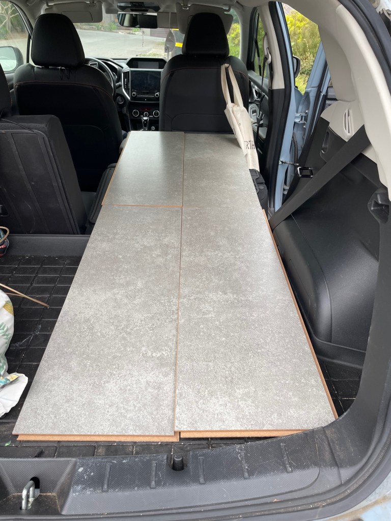 A kickboard might fill the gap. This thought suddenly came to me in the early morning hours. I had been wrestling with how I could fill the gap between the flattened back seat and the back of the passenger seat in my relatively tiny Subaru Crosstrek. I planned to car camp in a week to meet up with my daughter in southern California and pick up her dog for pet sitting while she was on a trip. I had seen people make all sorts of bed platforms for their SUV’s on youtube. Most of wood, and most requiring power saws. Something of which I lacked.
